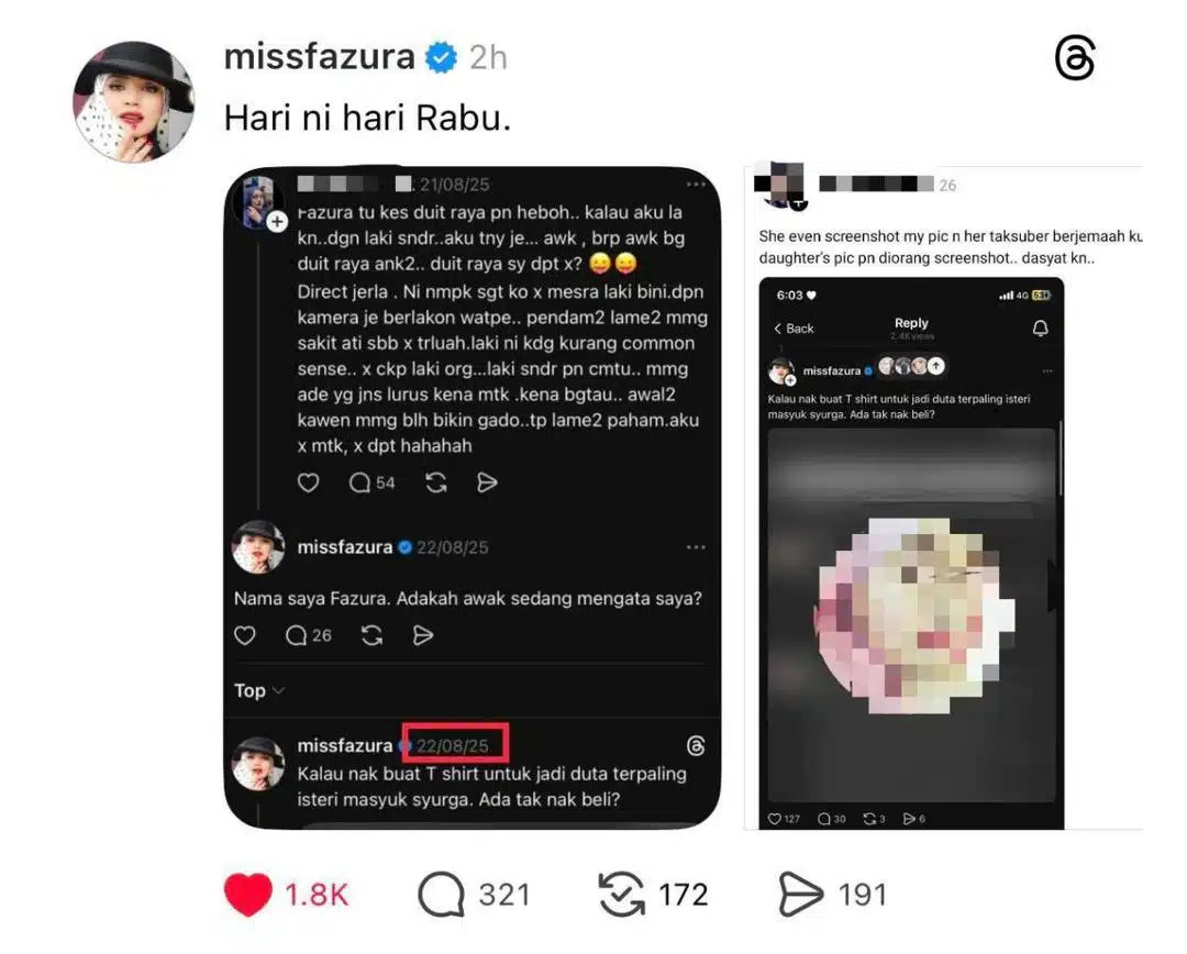 Fazura’s name is trending once again after an old claim involving her resurfaced on Threads. A screenshot shared online alleged that Fazura had bullied someone and reposted a picture of their child. Although the issue sparked attention, Fazura chose not to dive into the details.